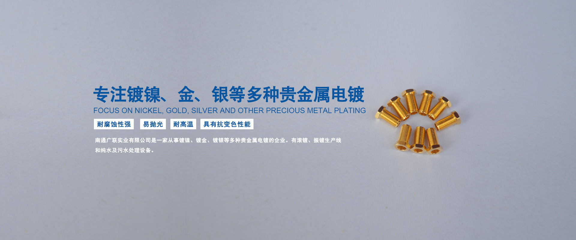 南通廣聯(lián)實業(yè)有限公司是一家從事鍍鎳、鍍金、鍍銀等多種貴金屬電鍍的企業(yè)。有滾鍍、振鍍生產(chǎn)線和純水及污水處理設(shè)備。